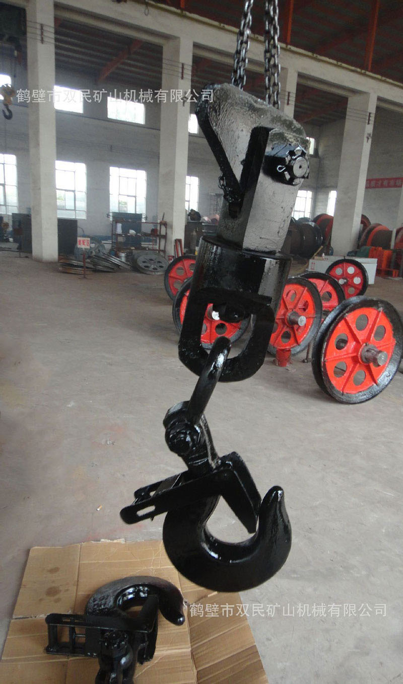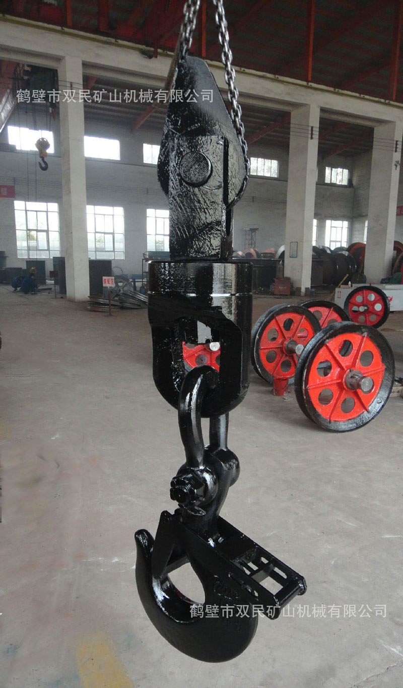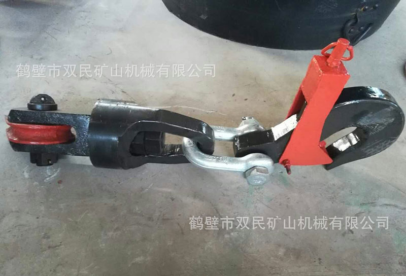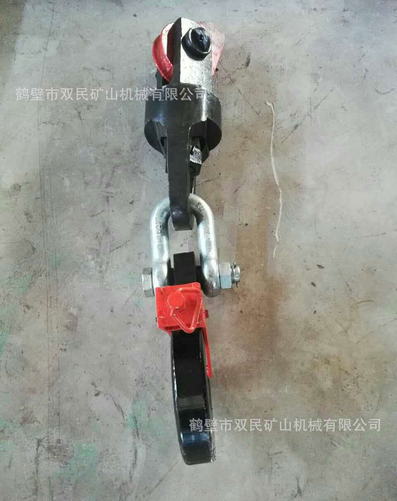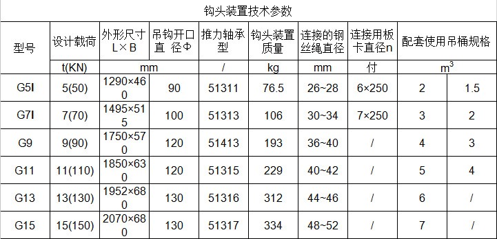 鉤頭及連接裝置,簡稱為鉤頭裝置。該產品結構簡單,使用性能單一。零件全部由鍛件加工而成,鋼絲繩連接采用了兩種型式,其中5t、7t采用不偏心護繩環,板卡