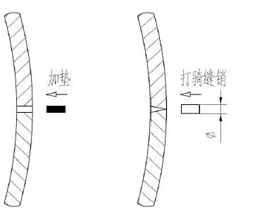 ①重 點檢查兩半卷筒的接合面部位是否出現縫隙。如果縫隙沿筒殼內外均勻,則可以從外側向縫隙填補薄鋼板,并將其固定牢靠;如果縫隙沿筒殼內外不均勻,一般是外側頂緊,造成貼緊的假象。可以從外側在接合縫部位打騎縫銷并可靠固定,將縫隙處撐緊。