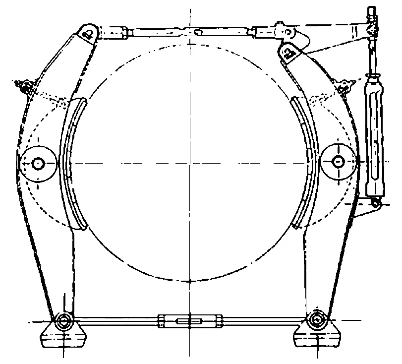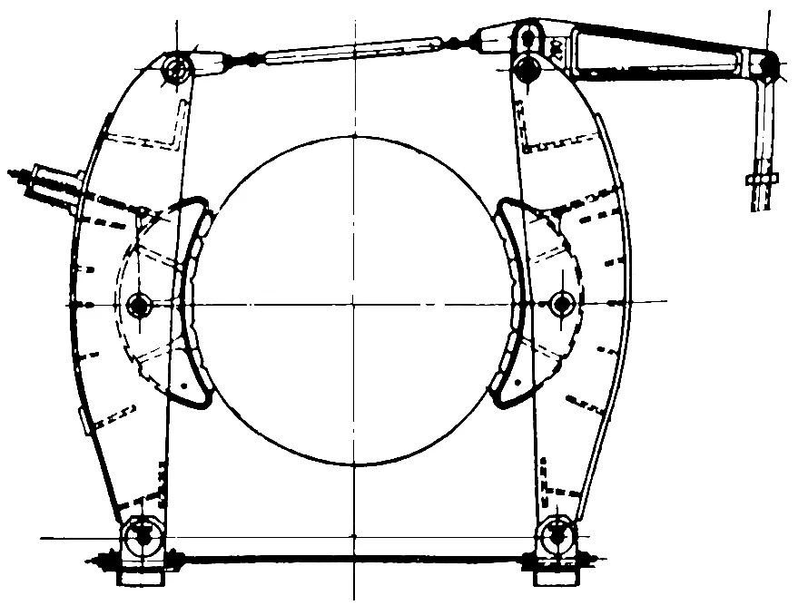 (3)綜合閘 早期國產的 JKA 型提升機,舊角移式閘瓦存在磨損不均問題,其制動系統的改造采用綜合閘(見圖 1),以減少閘瓦磨損,延長閘瓦使用壽命。