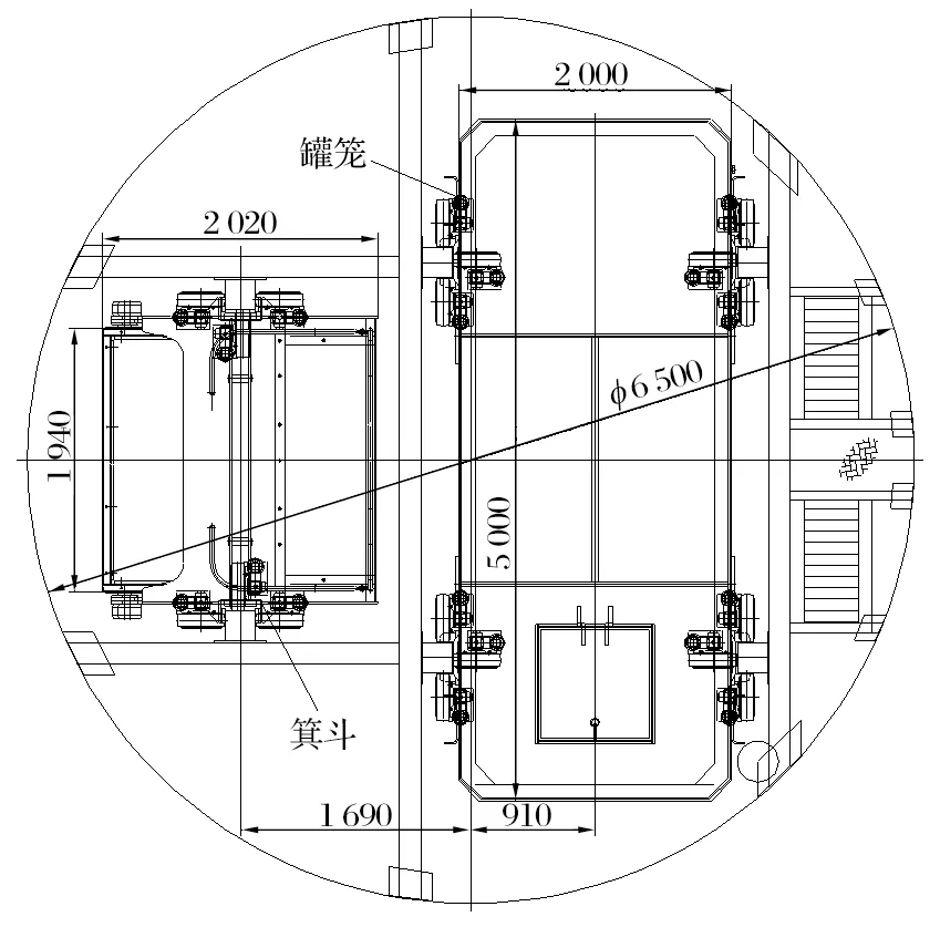 會澤礦業分公司3號豎井的井筒直徑為6.5 m,井筒布置為1臺箕斗配合1臺罐籠的混合提升方式。箕斗斷面為1 940 mm×2 0.0mm,罐籠斷面為5 0.0mm×2 0.0mm,井筒布置如圖1所示?;酚行莘e為13 m3,zui大載重 30.35t,自重 38 t,4 根尾繩總質量為118.39 t,因此箕斗終端載荷為186.74 t。罐籠配合箕斗提升,自重 38 t,4 根尾繩總質量為118.39 t,罐籠采用雙層結構。